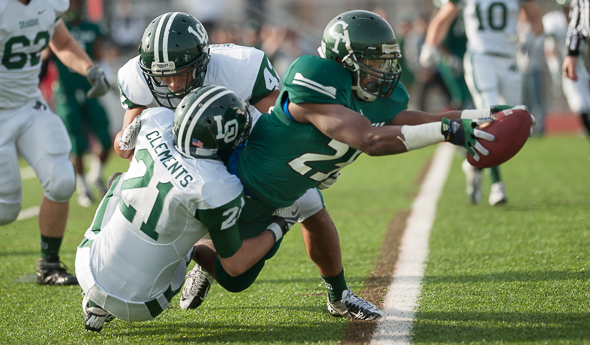 PHOTO: Detroit Cass Tech running back Mike Weber stretches for the go-ahead touchdown in the Technicians' Semifinal win Saturday at Troy Athens. (Click to see more at Terry McNamara Photography.)