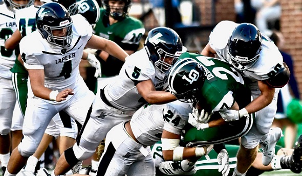PHOTO: Lapeer's defense swarms around a Lake Orion ball carrier during the Lightning's 17-7 win Thursday at University of Michigan. (Photo by Terry Lyons.)