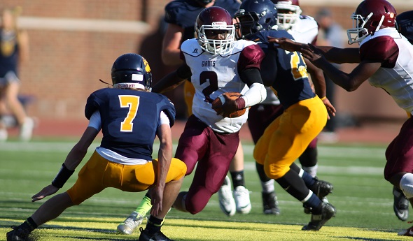 PHOTO: Kalamazoo Central, here on offense against St. Joseph last week at Michigan Stadium, will face Stevensville Lakeshore seeking its first win this season. (Click to see more from HighSchoolSportsScene.com.)