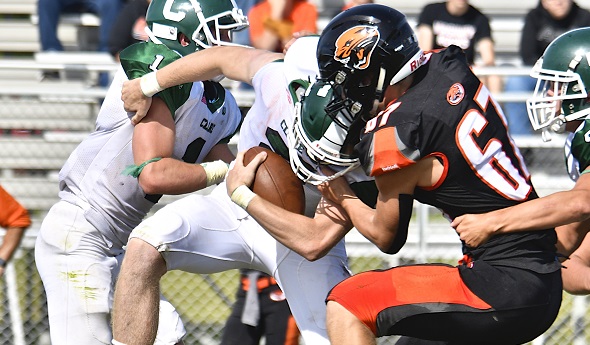 PHOTO: Clare, here on defense, opened with an impressive 35-0 shutout of Alma last week. (Click for more from HighSchoolSportsScene.com.)