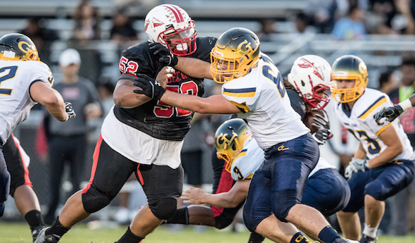 PHOTO: Lansing Sexton and Grand Ledge linemen lock up during Friday's Comets victory. (Click for more from HighSchoolSportsScene.com.)