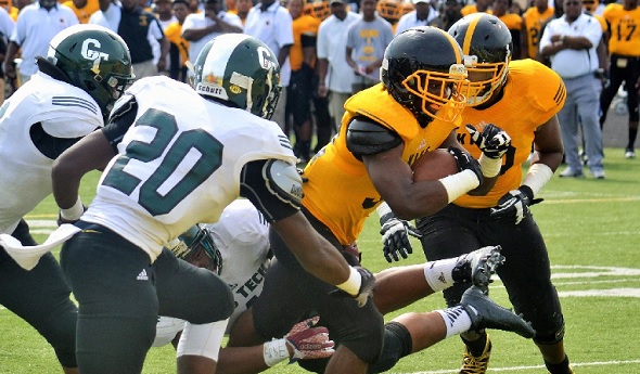 PHOTO: Detroit Martin Luther King, with ball, charged past rival Detroit Cass Tech in one of the state's most anticipated games this weekend. (Photo courtesy of the Detroit Public School League.)