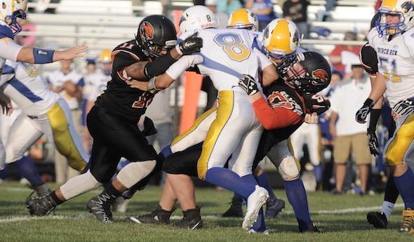 PHOTO: Alma defenders wrap up a Birch Run ball carrier during a 21-10 win on opening night. (Click for more from HighSchoolSportsScene.com.)