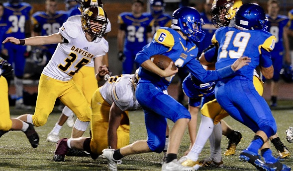 PHOTO: Davison defenders chase a Midland ball carrier during Friday's Chemics win. (Photo by Terry Lyons.)