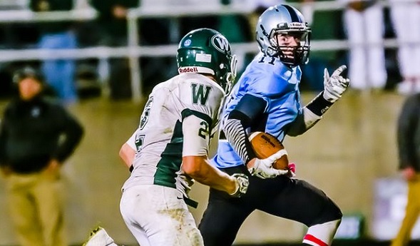 PHOTO: Lansing Catholic's Zac Baker was among recipients of quarterback Tony Poljan's 20 completions Friday as the Cougars defeated Williamston. (Photo courtesy of the Lansing State Journal.)
