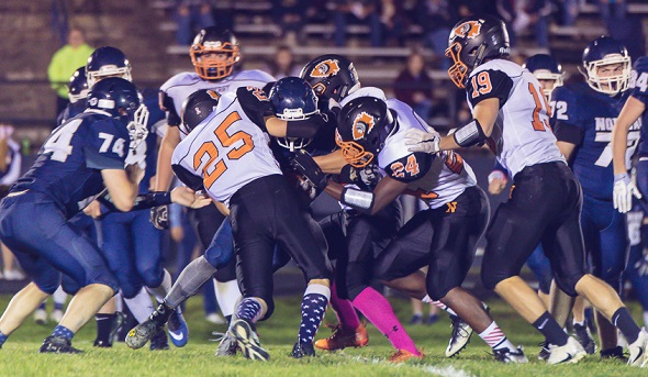 PHOTO: Newberry defenders swarm a Norway ball carrier in handing the Knights their first loss of the season Friday. (Photo by Jeff Rochefort.)