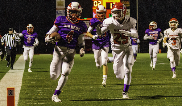 PHOTO: Clinton Township Chippewa Valley's Myles Harris (4) outraces a Romeo defender for a kickoff return touchdown Friday. (Photo by Chris Mudd Photography.)