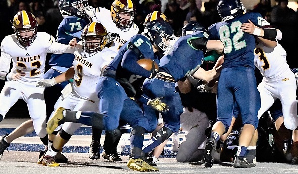 PHOTO: Lapeer pushes through for a touchdown during its league title-clinching win over Davison. (Photo by Terry Lyons.)