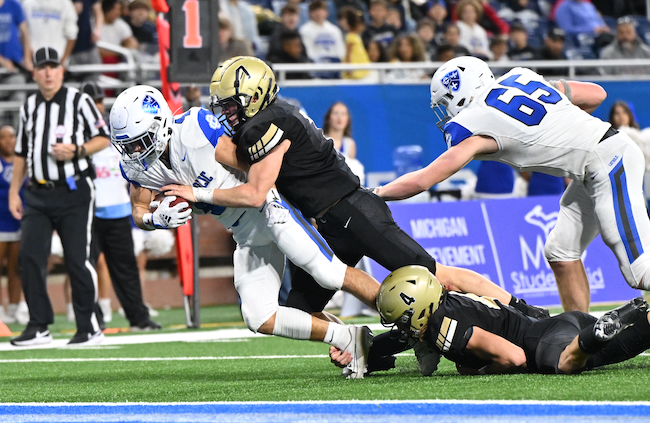 Orchard Lake St. Mary’s repeated as Division 2 champion following quarterback Jabin Gonzales (304 yards/4 TDs passing, 102 yards rushing) but also thanks to a stellar defensive effort against the Dreadnaughts’ record-setting offensive attack. The Eaglets held Dexter to just 266 total yards, and only 69 during the second half after taking a 24-14 lead into the break.