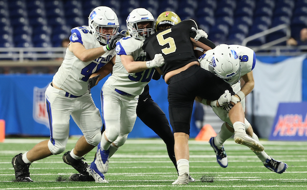 PHOTOS (Top) This collage shows action photos from all 10 MHSAA Finals played this season. (2) Orchard Lake St. Mary’s Kareem Pruit (7) brings down Dexter quarterback Cooper Arnedt in 11-player Division 2. (3) Kingsley’s Nolan Hodges (28) wraps up Lumen Christi’s Ayden Gatewood in Division 6. (4) Martin’s Seth Toris (24) charges through a hole with Montabella’s Noah Carlson lining up to attempt a tackle in 8-player Division 1.