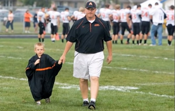 PHOTOS (Top) North Branch coach Jeremy Ferman and Almont junior Bryce Ferman hug after last year’s matchup between their teams. (Middle) Jeremy Ferman, then the coach at Almont, accompanies Bryce across the field about a decade ago. (Photos courtesy of the Ferman family.)