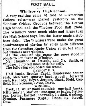 The following day’s paper provides only a few more details. The game was played on the Windsor Cricket Grounds. Despite the great disadvantage of playing under “American Football rules … quite different from the Canadian Rugby Union rules …” the “older and larger” Windsors won the contest, 12-6. Rosters for each squad were provided.