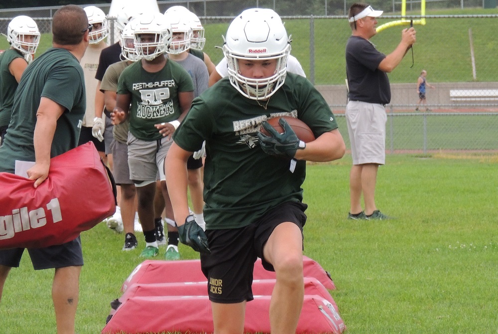 MUSKEGON – A Reeths-Puffer running back tripped and plowed into the Kit Kat-shaped bags he was supposed to be hurdling Monday, and his teammates laughed. The offensive line coach wore a shirt, like line coaches always do, that read “No One Works Harder Than The Offensive Line.” The sun came out about halfway through, but the breeze kept the weather just right, and after a hands-in, all-together “R-P!” someone shouted, “I’ve missed that!”