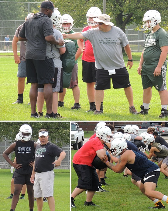 PHOTOS: (Top) Reeths-Puffer running backs hurdle a series of bags during a busy first practice Monday. (Middle) Clockwise from top: Assistant coaches Jari Brown (left) and Jeff Uganski work with the linemen; senior Marco Fields (front, blue sleeveless shirt) is among those working on his form; varsity coach Matt Bird works with one of his quarterbacks and their receivers. (Below) Bird gathers with his team at the end of their first practice of the season. (Photos by Geoff Kimmerly.)