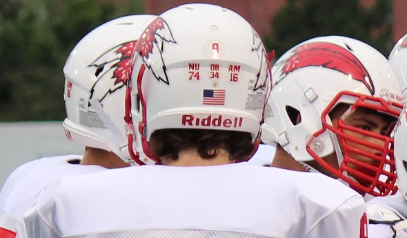 PHOTOS: (Top) Chippewa Valley players are wearing the numbers of three deceased teammates on the backs of their helmets this season. (Middle) Coach Scott Merchant addresses his players after last week's win against Lake Orion at Wayne State University.