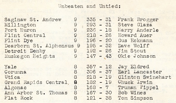 For the record, most newspaper writers gave the nod to both Flint Central and Muskegon Heights as the best in the state that season. Orville Peterson recalled that Flint Central had beaten an undefeated but once-tied Flint Northern team to end the year. That was indeed the case, as Coach Harold Auer's Indians downed coach Guy Houston's Vikings 20-6 on Thanksgiving Day at historic Atwood Stadium.