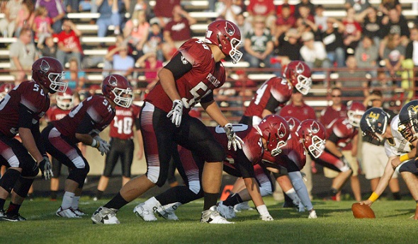 PHOTO: Portland’s defense, here against Ovid-Elsie on opening night, will be charged with shutting down a potent Lansing Catholic offense this week. (Click for more from HighSchoolSportsScene.com.)