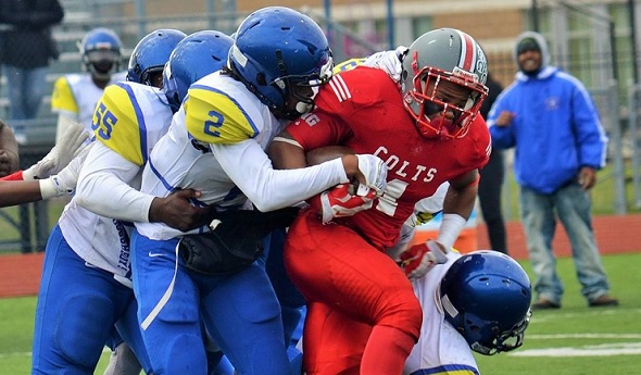 PHOTO: Detroit Collegiate Prep, in red, and enjoying its best season since 2007 (as Detroit Northwestern), will face Detroit Central Collegiate in the Public School League Division II championship game at Ford Field. (Photo courtesy of the Detroit Public School League.)