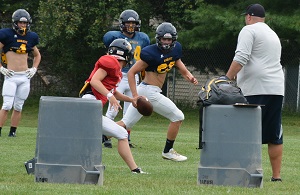 PHOTOS: (Top) Haslett lineman work on blocking during Monday's practice. (Middle) Vikings coach Charlie Otlewski instructs his players on one of the team's blocking schemes. (Below) Backs work on the option with barrels serving as the defensive front.