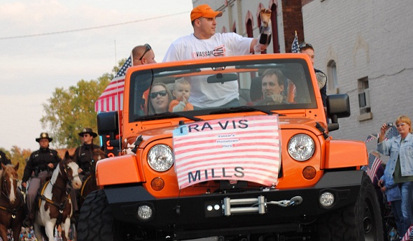 PHOTOS: (Top) Travis Mills served as the grand marshal of Vassar's Homecoming parade Oct. 5. (Middle) Mills returned to his former high school Friday to tell students about his experiences in Afghanistan. (Top photo by Vassar High senior Sarah McKenney; middle photo by English and journalism teacher Jamie Strauss.)