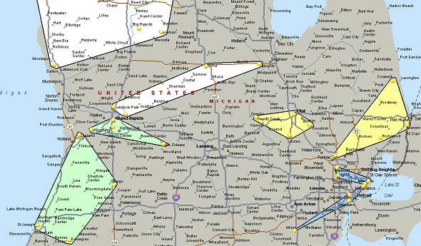 Four counties wide: Yes, on first glance it looks a little odd that Bay City John Glenn and Orchard Lake St. Mary’s would be in the same Division 3 District – but look at the map as a whole. Eight Division 3 teams are located south and mostly east of St. Mary’s, and John Glenn is the only team that could be considered in the northeastern quarter of the Lower Peninsula (Mount Pleasant and Gaylord are right down the middle and naturals to go with Sault Ste. Marie and Petoskey.). With the thumb playoff qualifiers of near-similar size in Division 4, there were no other options than to create this four-county trip between the Eaglets and Bobcats.