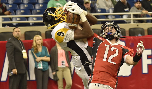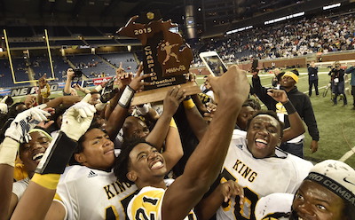 PHOTOS: (Top) Detroit Martin Luther King’s Donnie Corley pulls down a touchdown pass on the final play of the game to give the Crusaders the lead and win. (Middle) King players celebrate their second MHSAA championship.