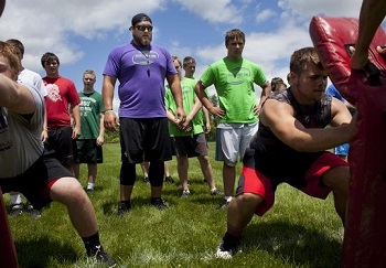 PHOTOS: (Top) Tennessee Titans offensive lineman Tim Lelito watches an athlete work out during a camp he conducts in the St. Clair area. (Middle) Lelito during his high school career at St. Clair. (Below) Lelito, middle, has worked this offseason to help pay participation fees for athletes in need of financial assistance. (Top and below photos courtesy of the Port Huron Times Herald.)