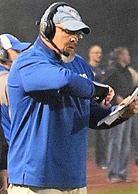 PHOTOS: (Top) Lenawee Christian quarterback Adam Baker follows his blocker during last week’s win over Pittsford. (Middle) Cougars coach Bill Wilharms checks out his play chart. (Photos by Stacy Kline.)