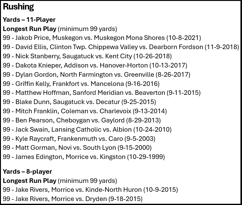 Morrice, coincidentally, also is the only program to have a 99-yard runner in 8-player football. Morrice switched from 11 to 8-player with the start of the 2014 season, and Jake Rivers made the 99-yard sprint twice in 2015.