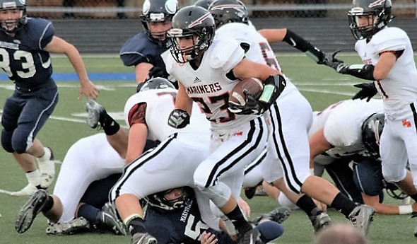 PHOTOS: (Top) Marine City's MJ Frank cuts through an opening against Marysville this season. (Middle) A group of Mariners surround and take down a Port Huron Northern ball carrier. (Photos courtesy of the Marine City football program.)