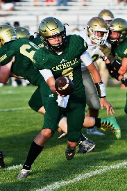 PHOTOS: (Top) Muskegon quarterback Cameron Martinez breaks through an opening during a Week 1 win against Warren DeLaSalle. (Middle) Martinez pulls away from a Detroit Martin Luther King defender during last week’s victory. (Below) Muskegon Catholic Central quarterback Max Price hands off during last week’s loss to Pontiac Notre Dame Prep. (Photos courtesy of Local Sports Journal.)