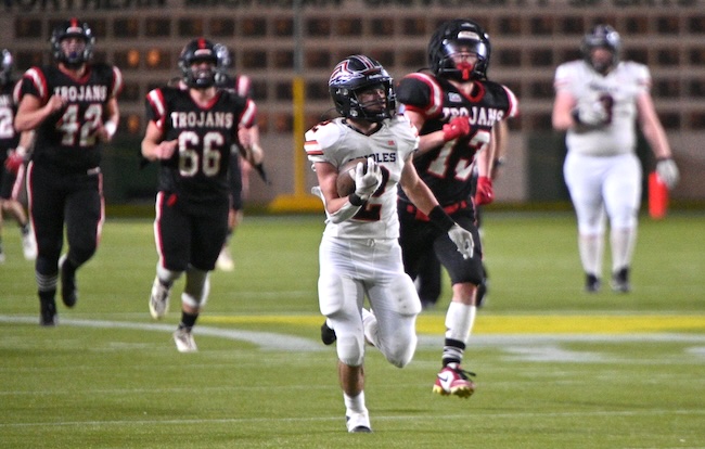 The Trojans added a third-quarter touchdown of their own as Stephens ran five yards for a score on the ensuing possession to make it 35-6. Morrice’s Wyatt Cartier ran one yard for a touchdown in the early stages of the fourth quarter, and Fisher returned a punt 85 yards for a TD with 5:30 left in the game, making it 35-20.
