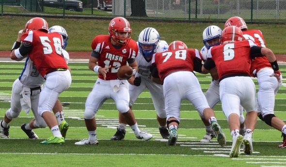 PHOTOS (Top) Pontiac Notre Dame Prep quarterback Sam Stowe (15) throws a pass during the Division 5 Final while protected by lineman Adrian Fernandez (56). (Middle) Fighting Irish coach Pat Fox leads his team – including Henry Ewles (72) and Brody Sink (7) – off the field.