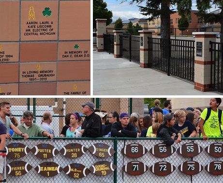 PHOTOS: (Top) The Community Memorial Stadium turf includes the logos of both its home teams, the shamrock for Sacred Heart and the oil derrick for Mount Pleasant High. (Middle top) Supporters have given to the stadium and the schools' players in multiple ways, from buys bricks and pillars to hanging signs. (Middle below) Sacred Heart runs a play against Beal City during Friday's game. (Bottom) Mount Pleasant High and Midland Dow players warm up before their game Friday night.