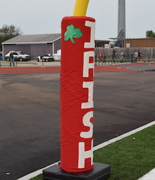 The uprights are padded specific to the team on the field; red for Sacred Heart's Irish and dark blue for Mount Pleasant High's Oilers.