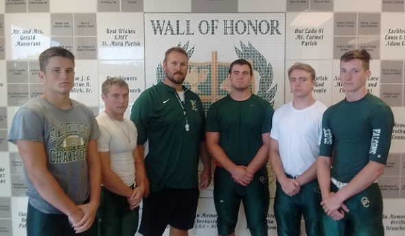 PHOTOS: (Top) Monroe St. Mary’s coach Adam Kipf and his captains stand together earlier this month (from left to right): Hunter Coombe, Justin Carrabino, Kipf, Riley Woolford, Mitchell Poupard and Austin Burger. (Middle) The Falcons’ helmets will feature decals again after going without during the program’s recent past.