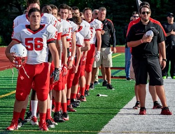 PHOTOS: (Top) Clockwise from left: Salem coach Justin Reed, Canton coach Andy Lafata and Plymouth coach Brian Lewis. (Middle) Lafata stands for the national anthem with his players. (Below) Salem players celebrate last week during a win over Wayne Memorial. (Photos submitted by respective athletic departments.)