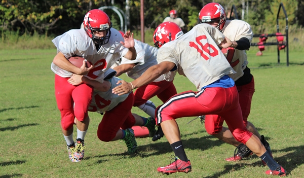 PHOTOS: (Top) Members of the North Central football team go through blocking and tackling drills at practice Wednesday in Powers. (Middle) North Central football coach Kevin Bellefeuil indicates a pass route he wants his receivers to take. (Below) Like North Central's helmets indicate, the Jets are flying high in their first season of 8-player, off to a 5-0 start while averaging 73.6 points a game. (Photos by Denny Grall.)
