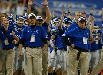 PHOTOS: (Top) Former Muskegon Oakridge football coach Jack Schugars holds up the 2005 Division 5 championship trophy with his players after their victory at Ford Field. (Middle) Schugars (right, with headset) monitors his team's play on the field against Jackson Lumen Christi.