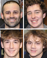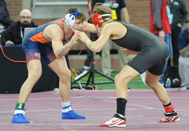 PHOTOS (Top) Gobles junior Jackson Geiger (74) squares up to make a block during his team’s game against Concord this season. (Middle) Clockwise from top left: Gobles coach Greg Eichler, Geiger, Mason Mansfield and Nathan Ray. (Below) Mansfield, left, wrestles during the first round of last season’s Individual Finals at Ford Field. (Top photo by Kathie Brown/Creative Photography. Head shots by Pam Shebest. Wrestling photo by High School Sports Scene.)