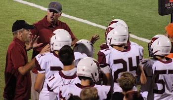 PHOTOS: (Top) Senior guard Dayton Rose pulls down the line as Alex Andrews gets a handoff from quarterback Owen Swanson during Orchard View’s 42-35 win at Belding on Sept. 20. (Middle) First-year coach Fred Rademacher (gray hat) talks to his team during that Cardinals' win. (Below) Orchard View is back to playing wing-T football as the backfield, from left, of Alex Andrews, Brendan Hyatt and Edmari Mitchell get their proper spacing before a play during a 32-20 win over visiting North Muskegon on Oct. 25. (Photos by Katie Ream.)