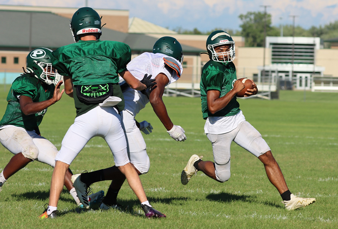 PHOTOS (Top) Jabrael Powell cuts into an opening during Pennfield’s intrasquad scrimmage this month. (Middle) From left: Thomas Kurtz, coach Robbie Hattan and senior Daniel Wells stand together in the team’s new stadium. (Below) Isaiah Adams, carrying the ball, works to get to the edge with a defender in pursuit. (Action photos courtesy of Pennfield Sports Nation; stadium photo by Pam Shebest.)
