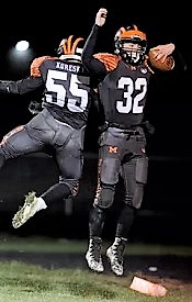 PHOTOS: (Top) Morrice quarterback Hunter Nowak (32) pulls away from a Colon defender during last week’s Semifinal win over the Magi. (Middle) Nowak and teammate Sam Koresky celebrate one of his touchdowns. (Photos courtesy of the Lansing State Journal.)