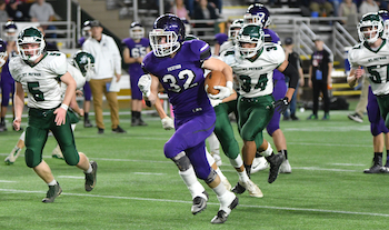 PHOTOS: (Top) Pickford celebrates its first football championship Saturday at the Superior Dome. (Middle) The Panthers’ Matt Bush (32) breaks into the open while Portland St. Patrick defenders chase. (Photos by Cara Kamps.)