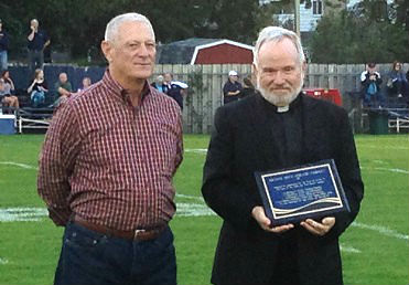 PHOTOS: (Top) Our Lady of the Lakes football coach Mike Boyd hoists the Division 8 championship trophy in 2002 after his team defeated Gaylord St. Mary at the Pontiac Silverdome. (Middle) Boyd (left) receives a plaque from Rev. Lawrence Delonnay, Our Lady’s pastor, on Friday to recognize the naming of the school’s athletic complex in Boyd’s honor.
