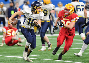With just over a minute left in the first quarter, senior Caleb Miller’s 42-yard punt pinned the Huskies on their 1-yard-line. On the next play, Miller got a sack and the ball came loose, and junior Elijah Strine ended up with it in the end zone – the first fumble recovery for a touchdown in MHSAA championship game history. Senior