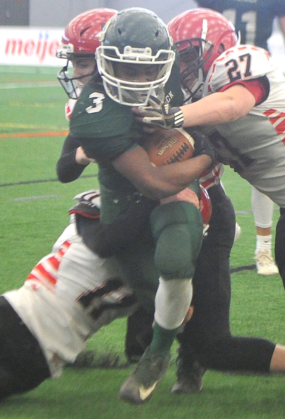 The North Central Jets (11-0), who won their third MHSAA Finals championship, sacked St. Patrick quarterback Connor Cross seven times. But he completed 25 of 38 passes for 374 yards and six touchdowns.