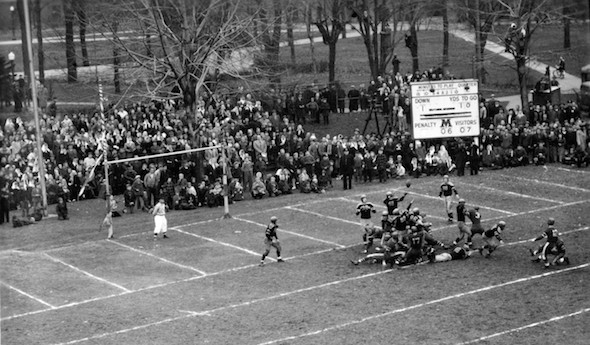 Statewide coverage of the pending heavy-weight battle enticed many from around the state to attend the game. A crowd of 13,500 – still the largest ever to visit Hackley – packed nearly every square inch of the stadium, bleachers and field. Countless others tuned in to the radio broadcast.