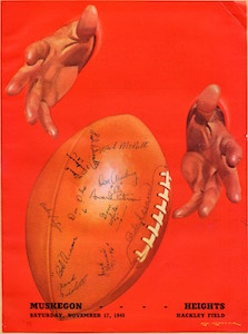 “Twenty-thousand Muskegon fans will watch their high school giants – Muskegon and Muskegon Heights – battle for a mythical Michigan championship Saturday. Only the limited seating capacity of the city’s Hackley Stadium prevents the attendance from reaching 30,000. Reserve seat tickets have been completely sold out for three weeks.