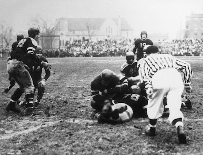 PHOTOS: (Top) Muskegon's Tommy Carr attempts an extra point against Muskegon Heights during their history-making matchup. (Middle) The game program from 1945. (Below) Heights stops Muskegon during its final goal line stand; Big Reds quarterback Howard Peterson is number 19. (Photos provided by Ron Pesch.)